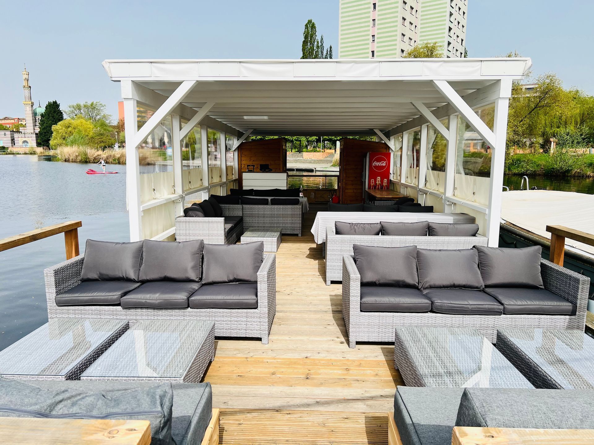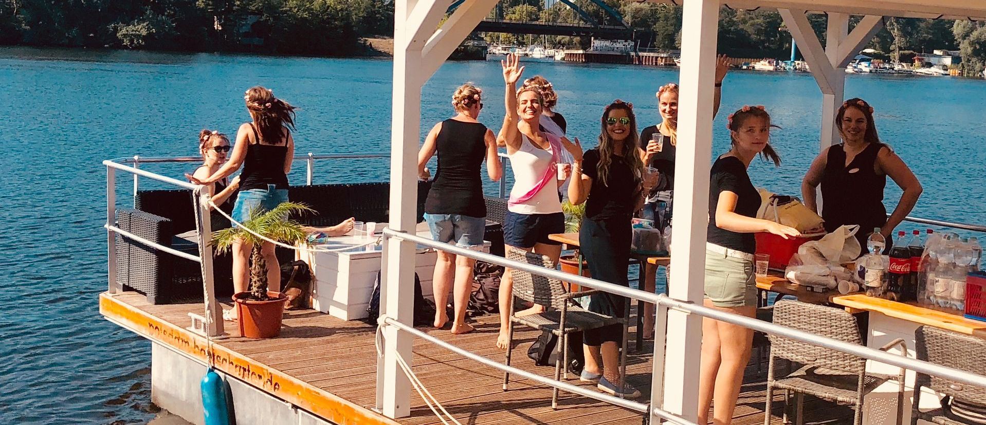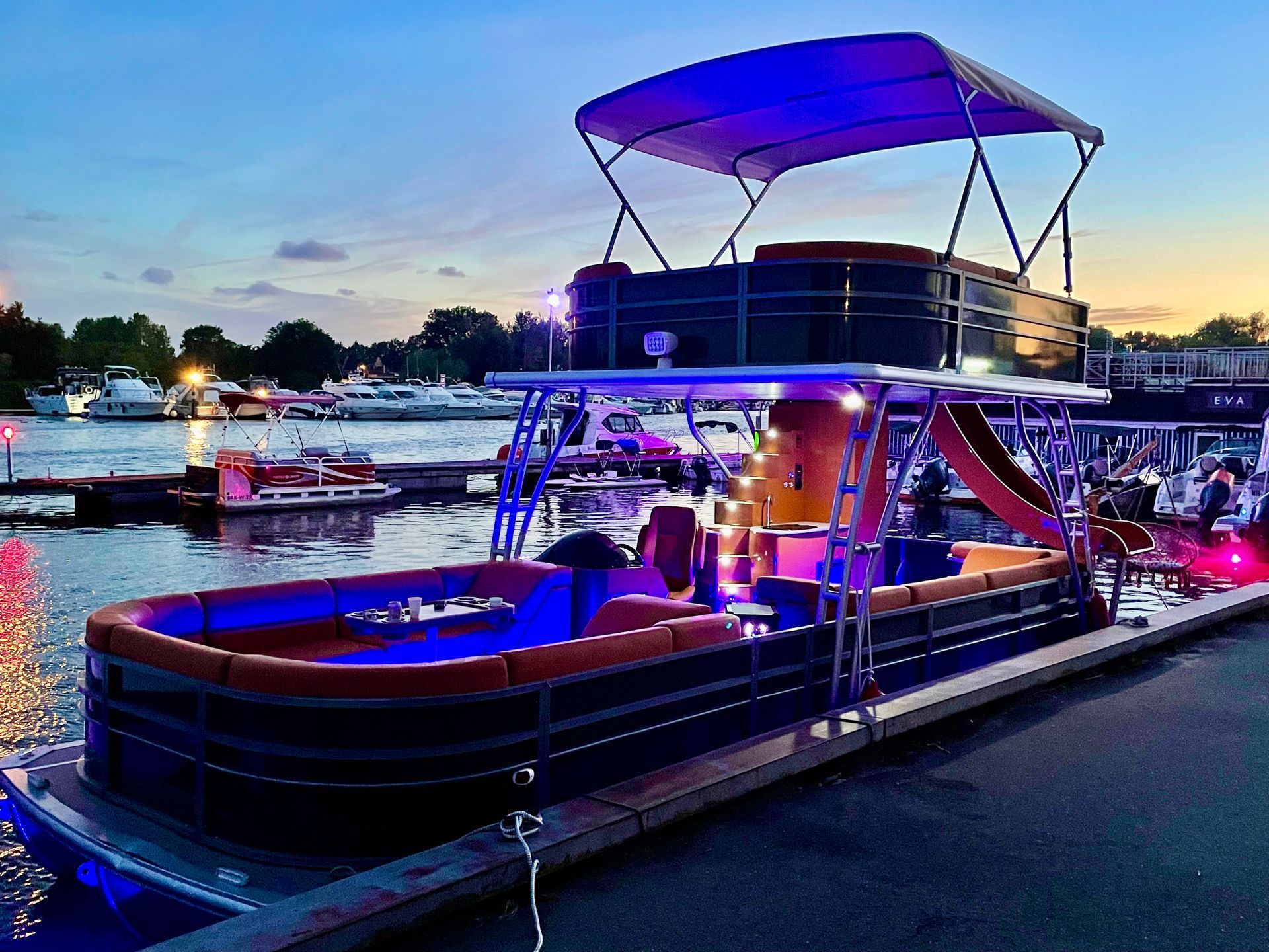 Luxuriöses Pontonboot bis 12 Personen mit Skipper und WC und Rutsche